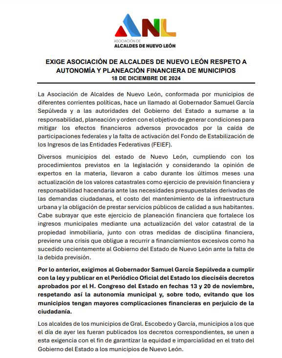 EXIGE ASOCIACION DE ALCALDES DE NUEVO LEON…