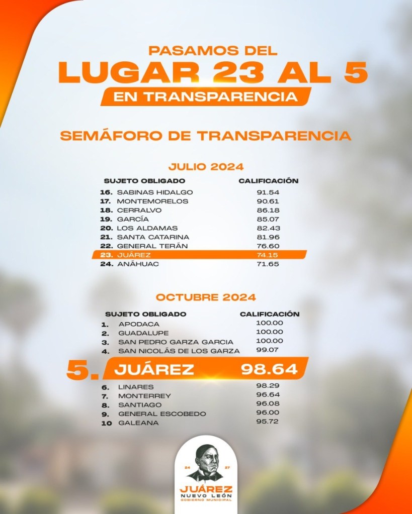 Juárez, Nuevo León., a 27 de febrero de 2025.- Como resultado de la implementación de mejores prácticas en la actual administración municipal, el gobierno de Juárez presidido por el alcalde Félix Arratia Cruz, logró alcanzar el quinto lugar en el Semáforo de Transparencia.