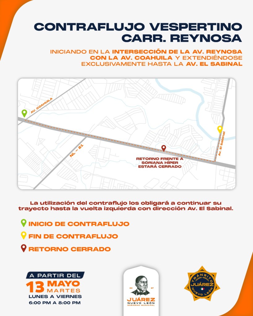 Juárez, Nuevo León, a 12 de mayo del 2025.- Con el objetivo de mejorar la movilidad y reducir los tiempos de traslado en una de las zonas con mayor afluencia vehicular, el Gobierno Municipal de Juárez informa que a partir del martes 13 de mayo entrará en operación un carril de contraflujo vespertino, que abarca de la Avenida Coahuila a la Avenida El Sabinal, sobre Avenida Reynosa.